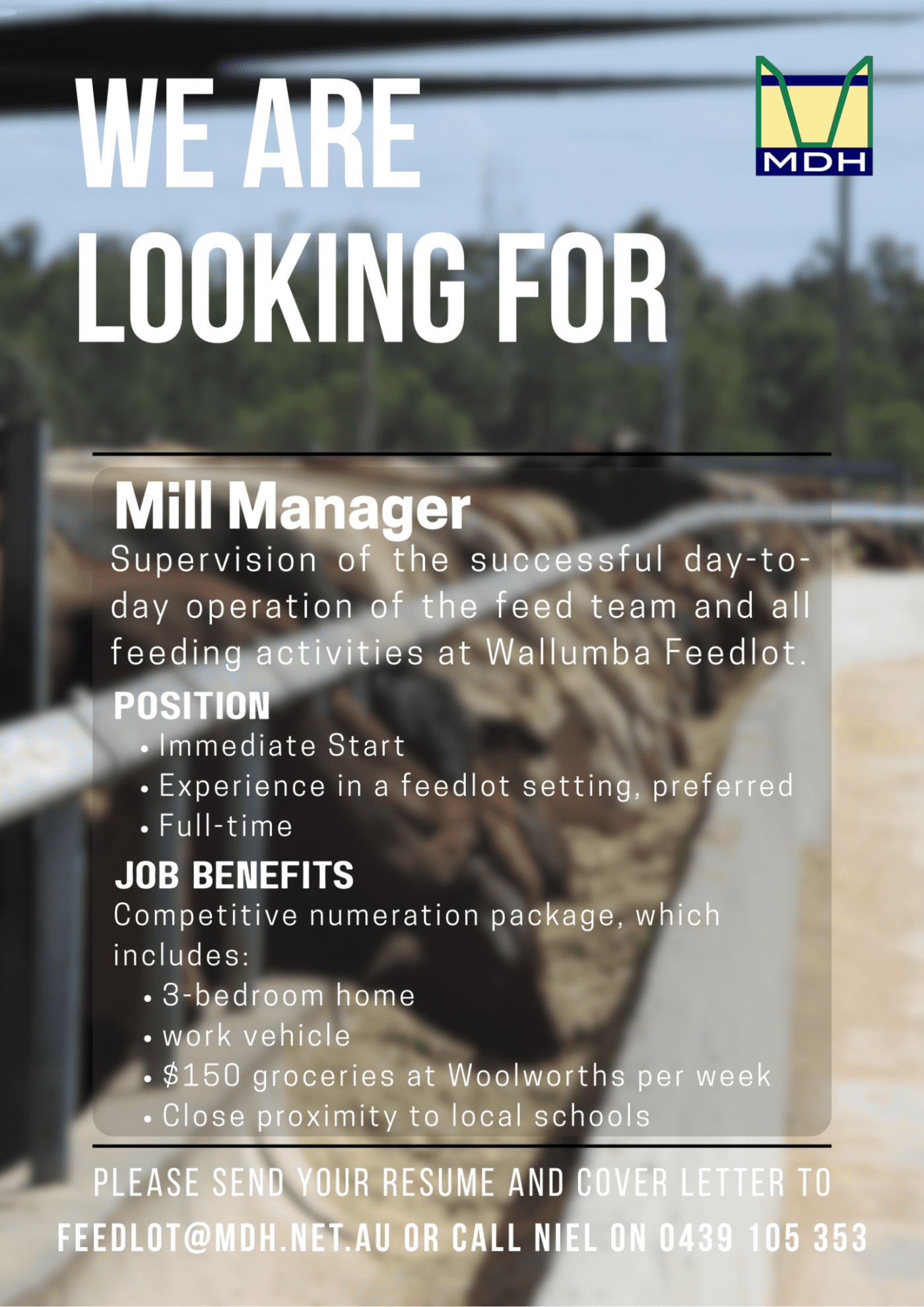 Family owned and operated MDH Pty Ltd is now recruiting a Mill Manager for the supervision of the successful day-to-day operation of the feed team and all feeding activities at Wallumba Feedlot situated near Condamine Qld.